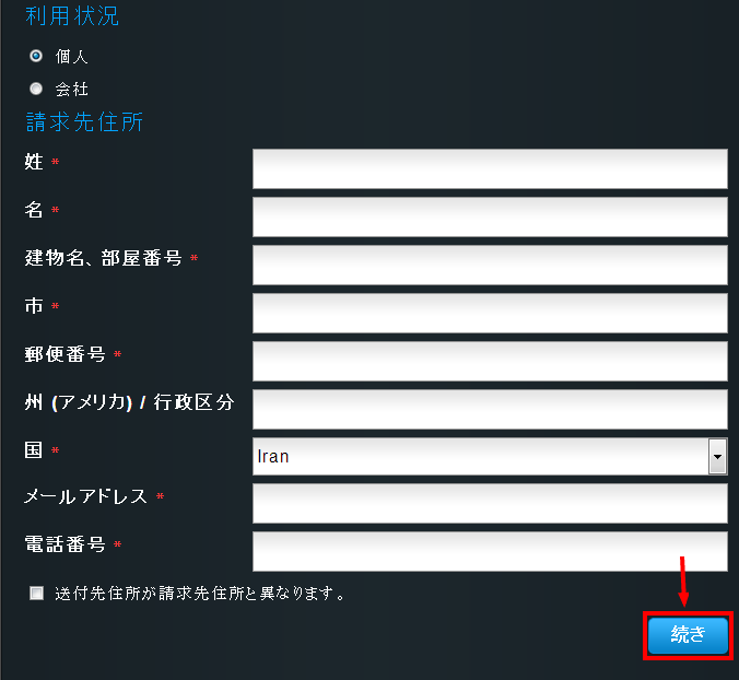 お客様のお名前、カタカナ、ご住所、郵便番号、お電話番号。